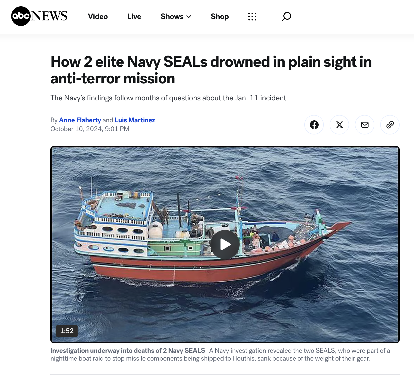 Members of search-and-rescue (SAR) and special operations units can drown: This Canadian SAR team lost their team lead to drowning during a rescue. Two United States Navy SEALs fell into the water during a visit, board, search, seizure (VBSS) operation and sank rapidly due to the weight of their equipment. One of them was also a Division 1 collegiate swimmer before joining the SEALs. In operations like these, systemic failures arise from more complex reasons but the result can still be drowning.
