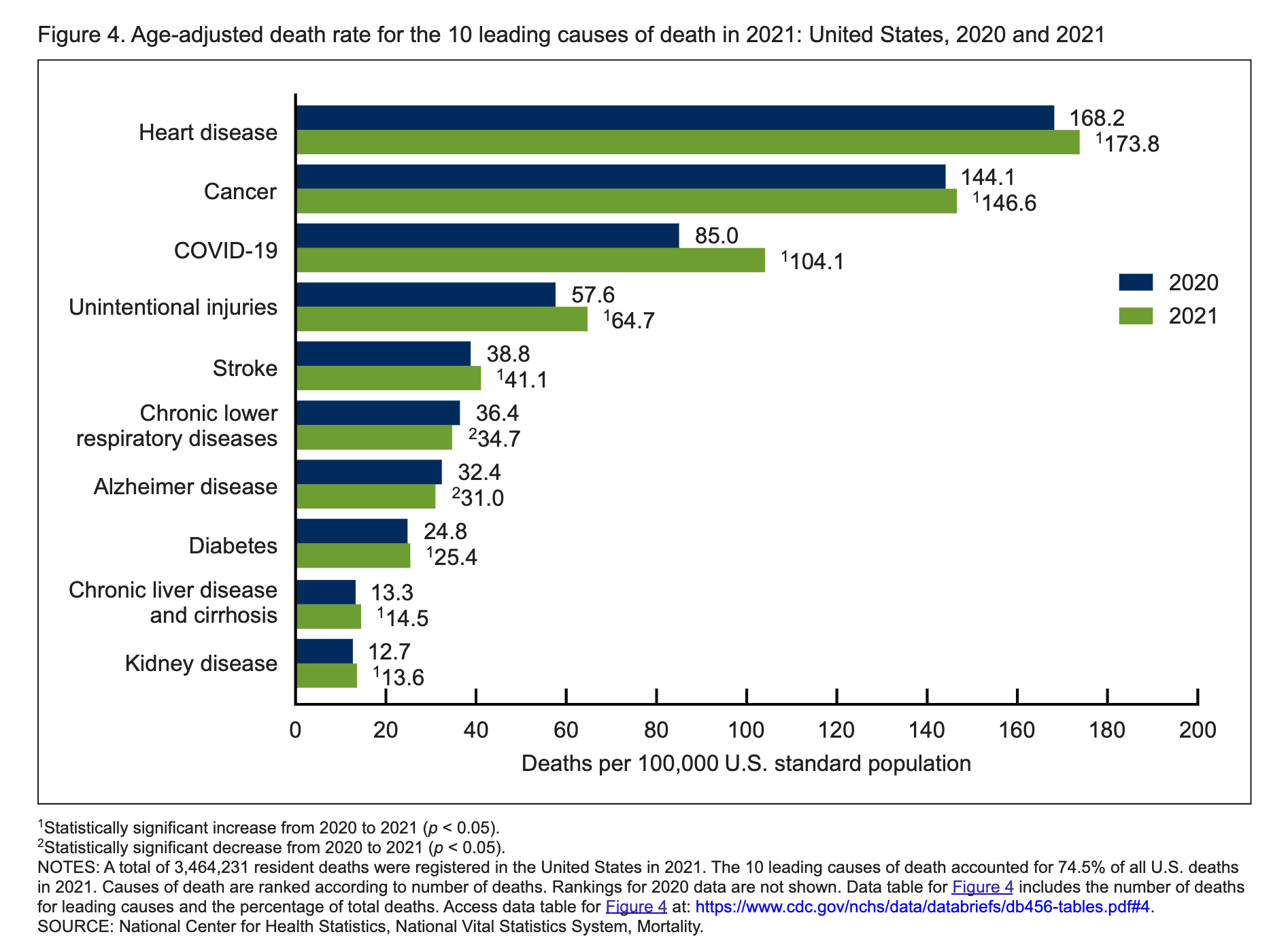 From the CDC, here are the rates of the leading causes of death in the US as of 2021 (the data analysis lags a few years) per 100,000 people: