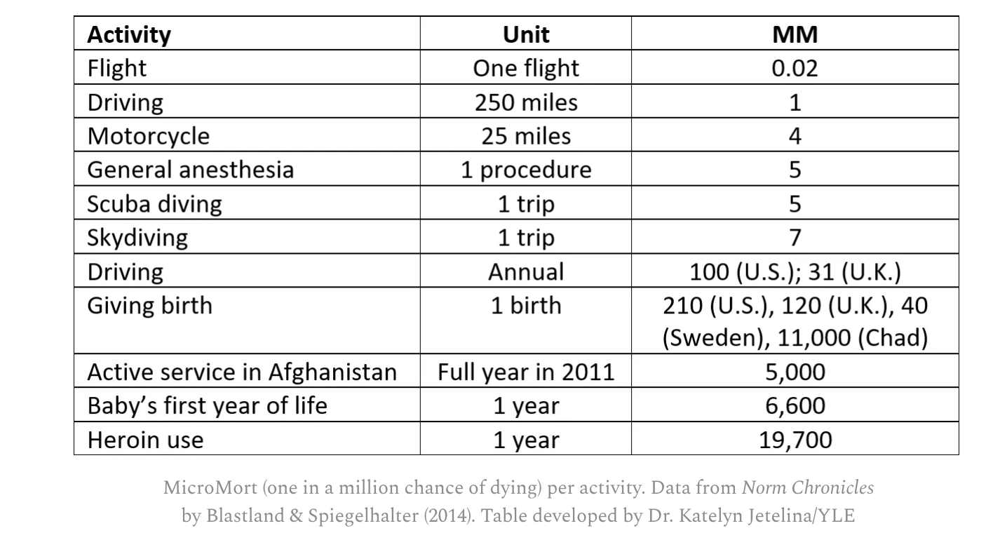 micromorts.rip maintains a handy table of micromort values for different activities.